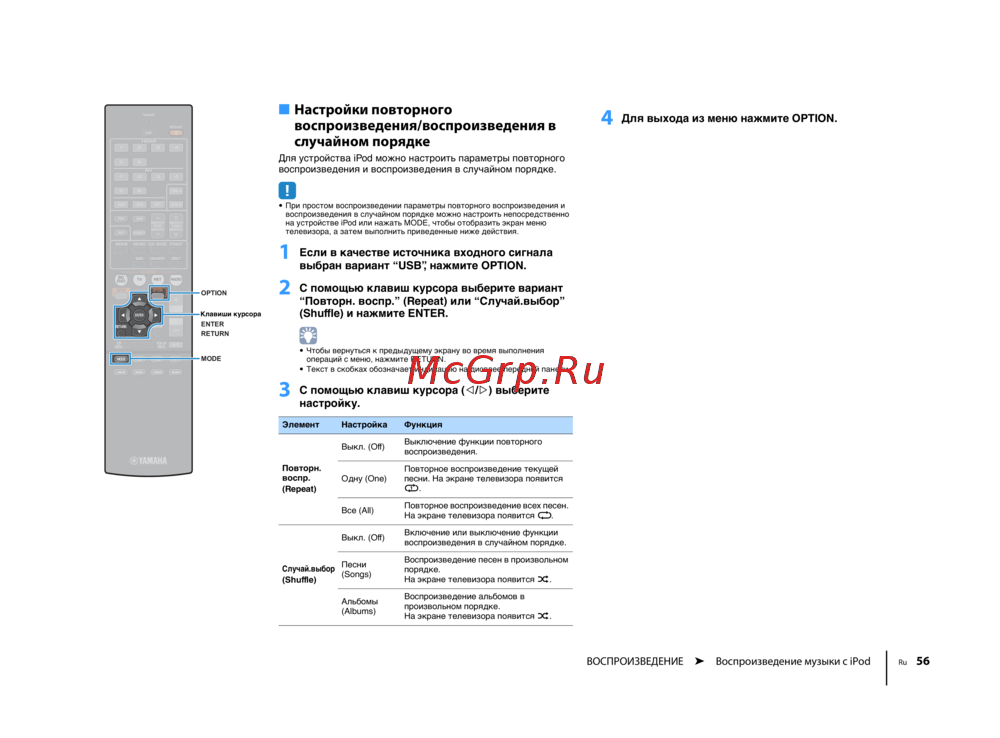 ВОСПРОИЗВЕДЕНИЕ ➤ Воспроизведение музыки с iPod Ru 56