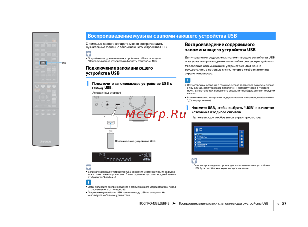 ВОСПРОИЗВЕДЕНИЕ ➤ Воспроизведение музыки с запоминающего устройства USB Ru 57