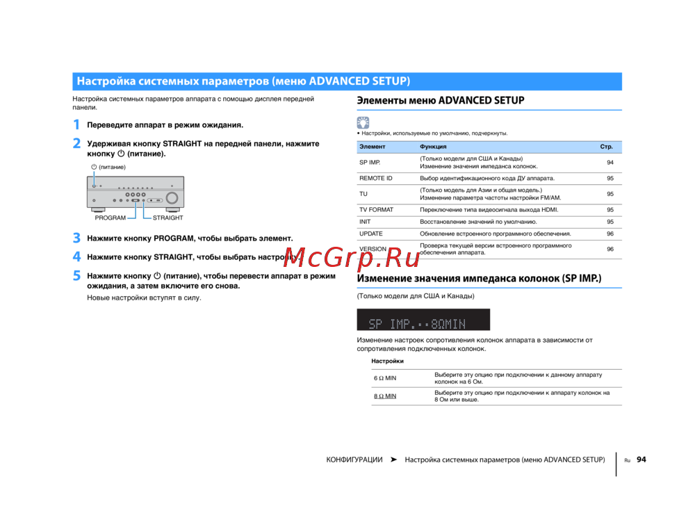 КОНФИГУРАЦИИ ➤ Настройка системных параметров (меню ADVANCED SETUP) Ru 94