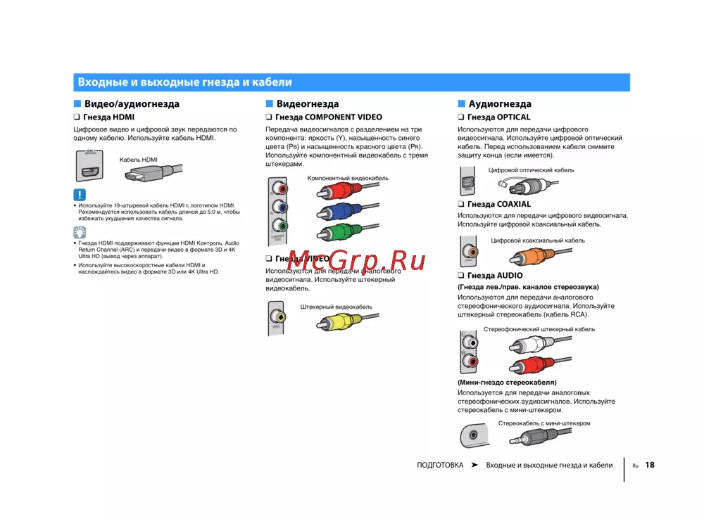 ПОДГОТОВКА ➤ Входные и выходные гнезда и кабели Ru 18