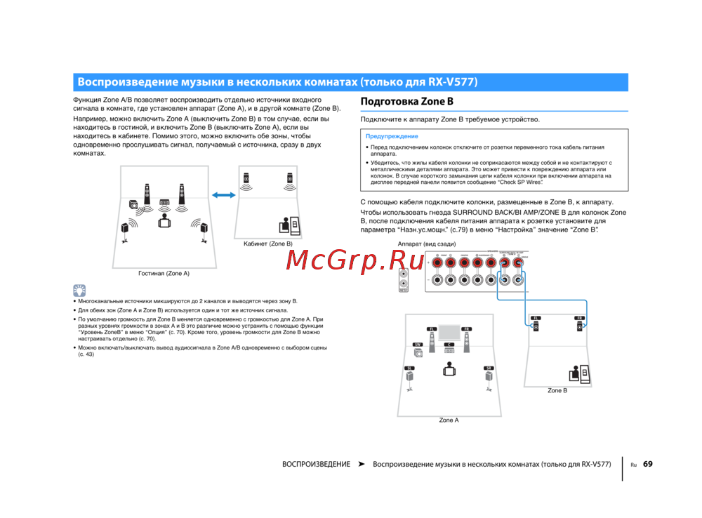 ВОСПРОИЗВЕДЕНИЕ ➤ Воспроизведение музыки в нескольких комнатах (только для RX-V577) Ru 69