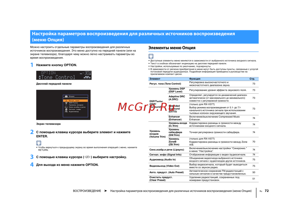 ВОСПРОИЗВЕДЕНИЕ ➤ Настройка параметров воспроизведения для различных источников воспроизведения (меню Опция) Ru 72