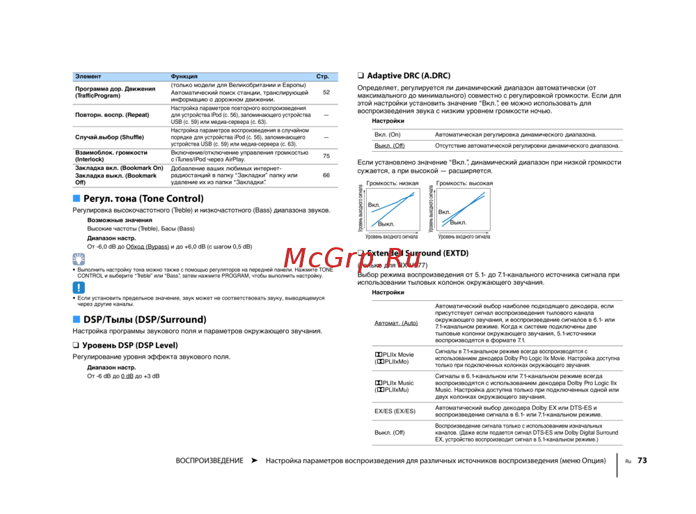 ВОСПРОИЗВЕДЕНИЕ ➤ Настройка параметров воспроизведения для различных источников воспроизведения (меню Опция) Ru 73
