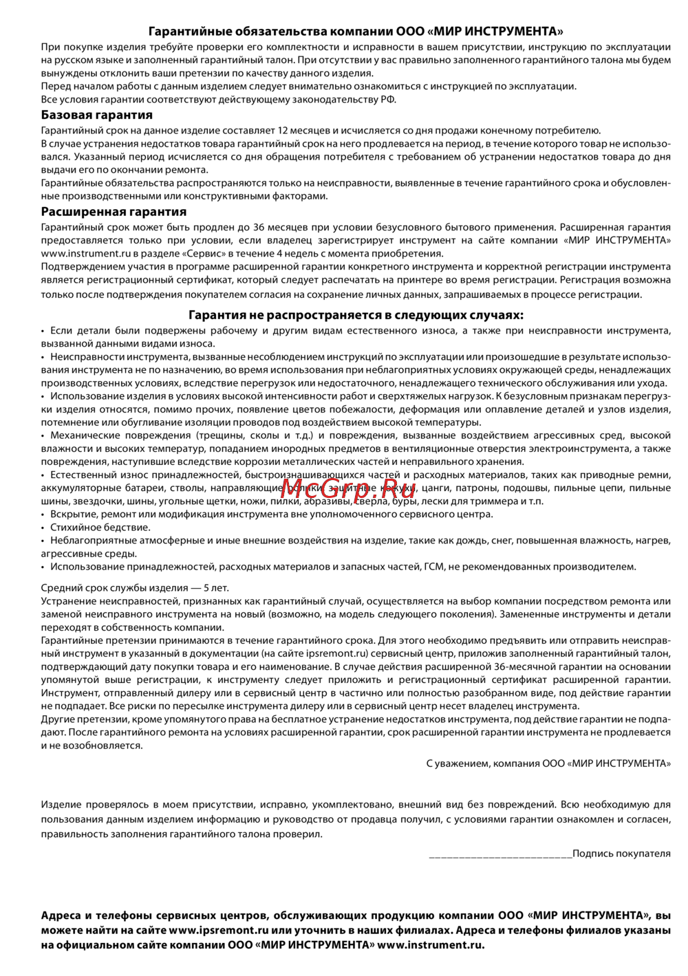 ный инструмент в указанный в документации (на сайте ipsremont.ru) сервисный центр, приложив заполненный гарантийный талон,