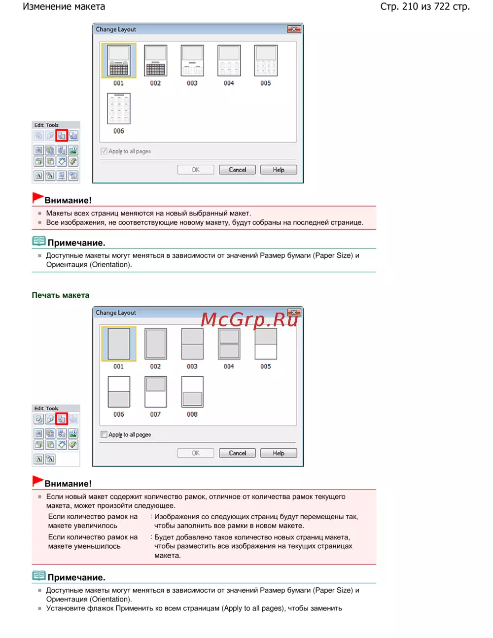 Узнайте, как изменение макета страниц влияет на изображения при печати. Узнайте о правилах копирования, замены страниц и зависимости от размера бумаги и ориентации. Применение изменений ко всем страницам.