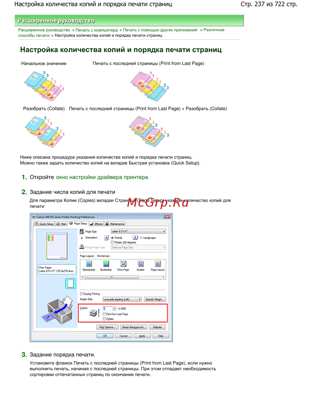 Canon Pixma MP 272 — настройка количества копий и порядка печати страниц [237/722]