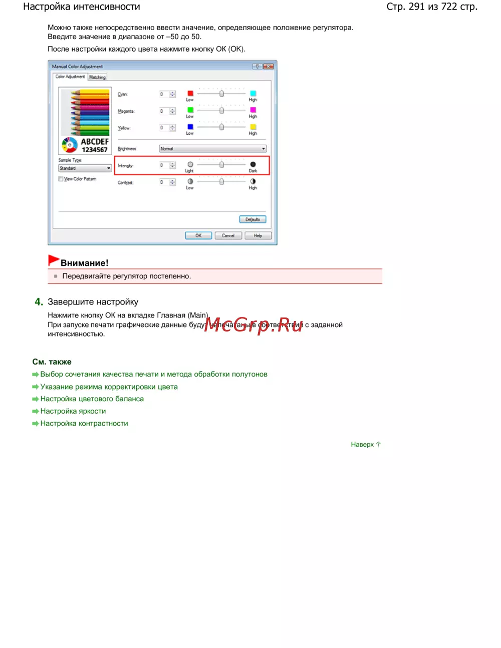 Настройте интенсивность печати с помощью регулятора в диапазоне -50 до 50. Нажмите OK после каждого цвета. Перемещайте регулятор плавно. Завершите настройку на вкладке Main. Узнайте о выборе качества печати, цветовой коррекции и баланса.