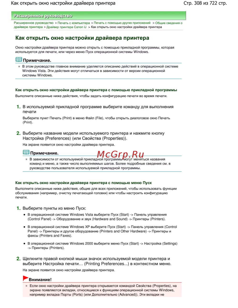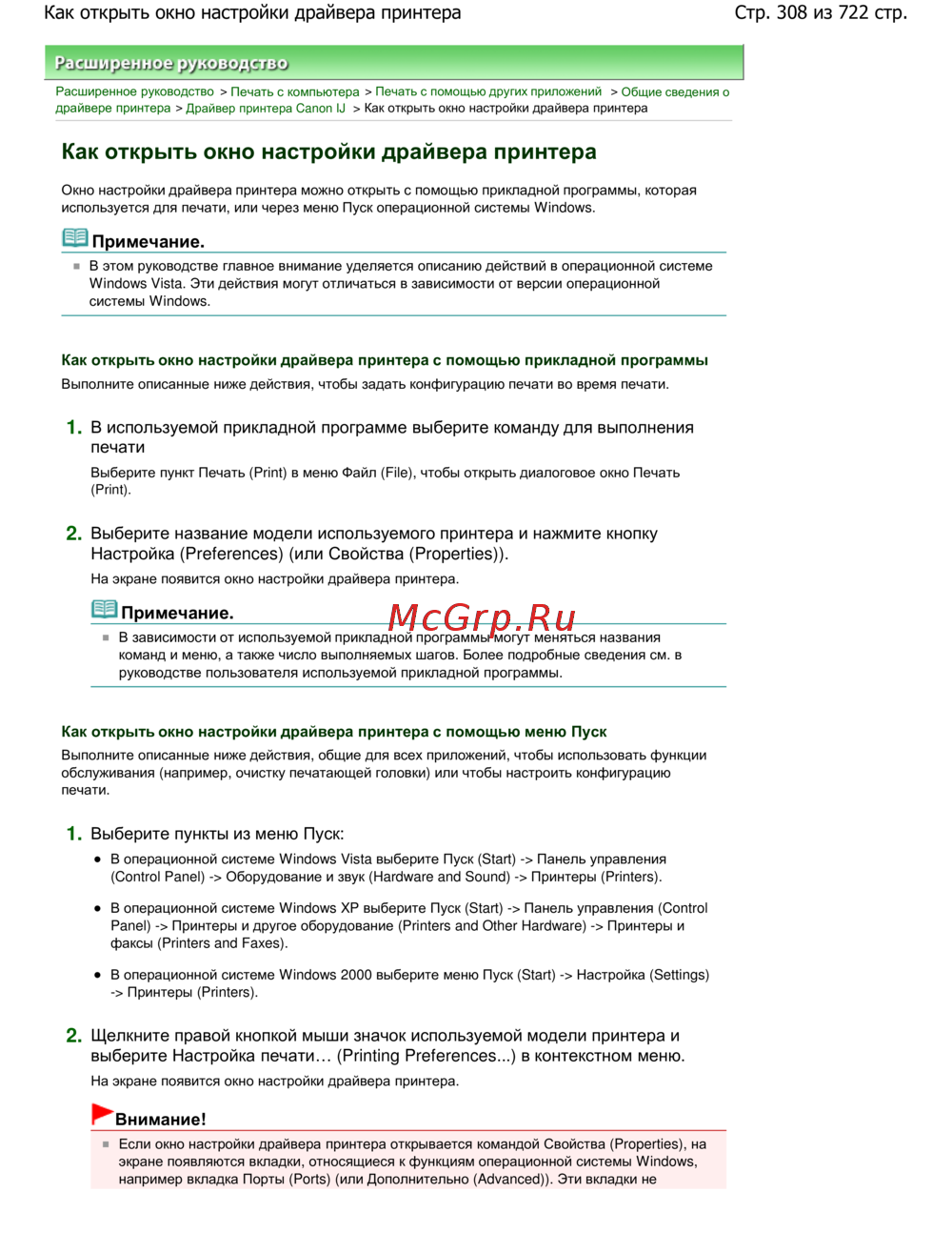 Стр. 308 из 722 стр.Как открыть окно настройки драйвера принтера