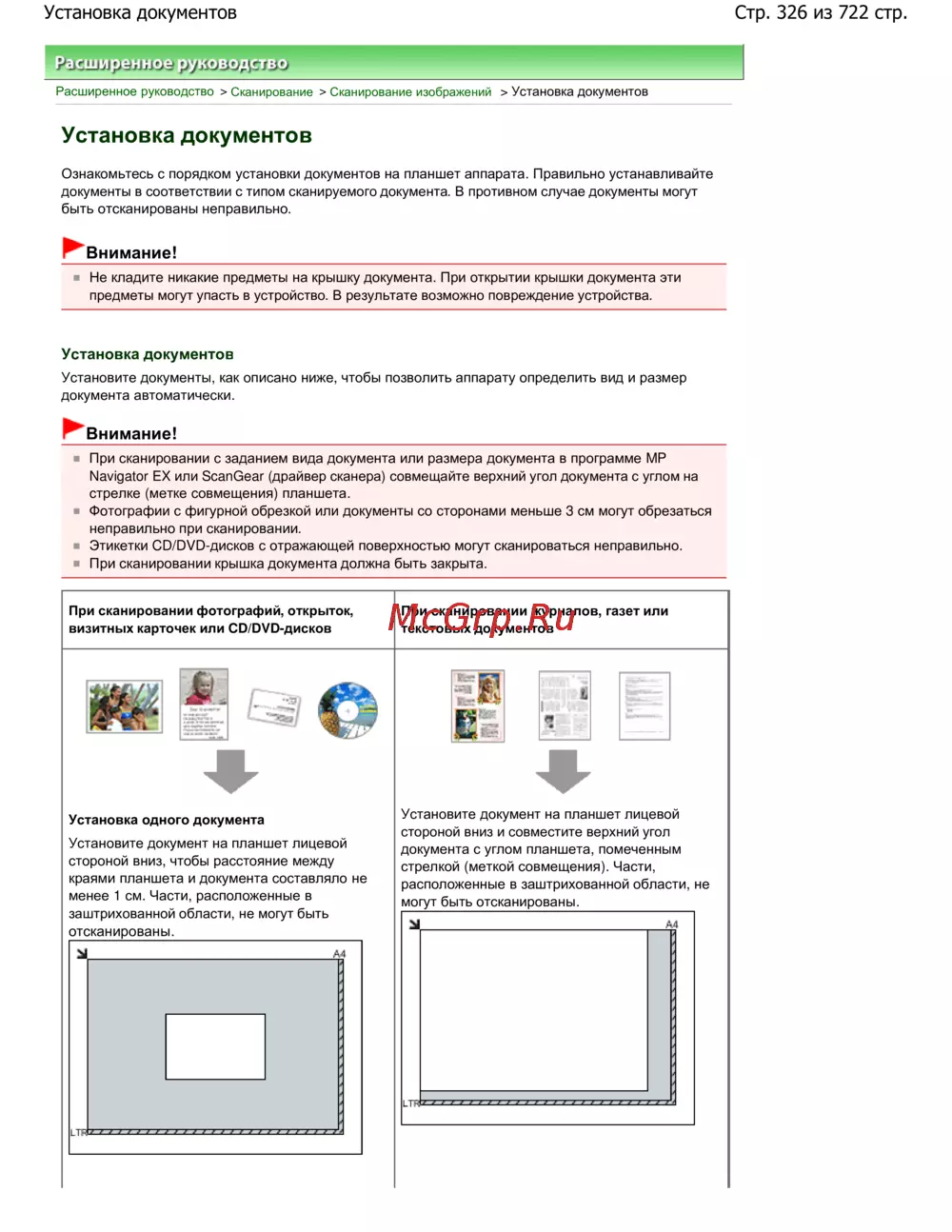 Canon Pixma MP 272 — как правильно устанавливать документы на планшетный сканер для точного сканирования [326/722]