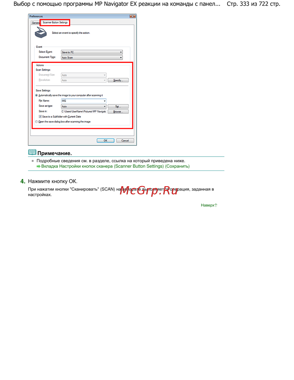 Стр. 333 из 722 стр.Выбор с помощью программы MP Navigator EX реакции на команды с панел...