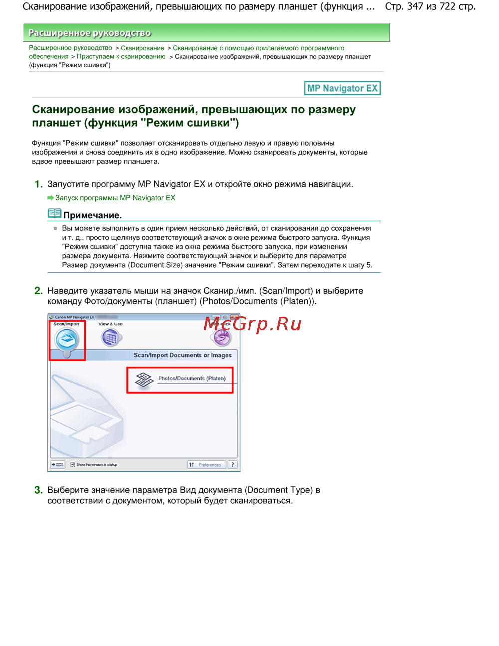 Стр. 347 из 722 стр.Сканирование изображений, превышающих по размеру планшет (функция ...