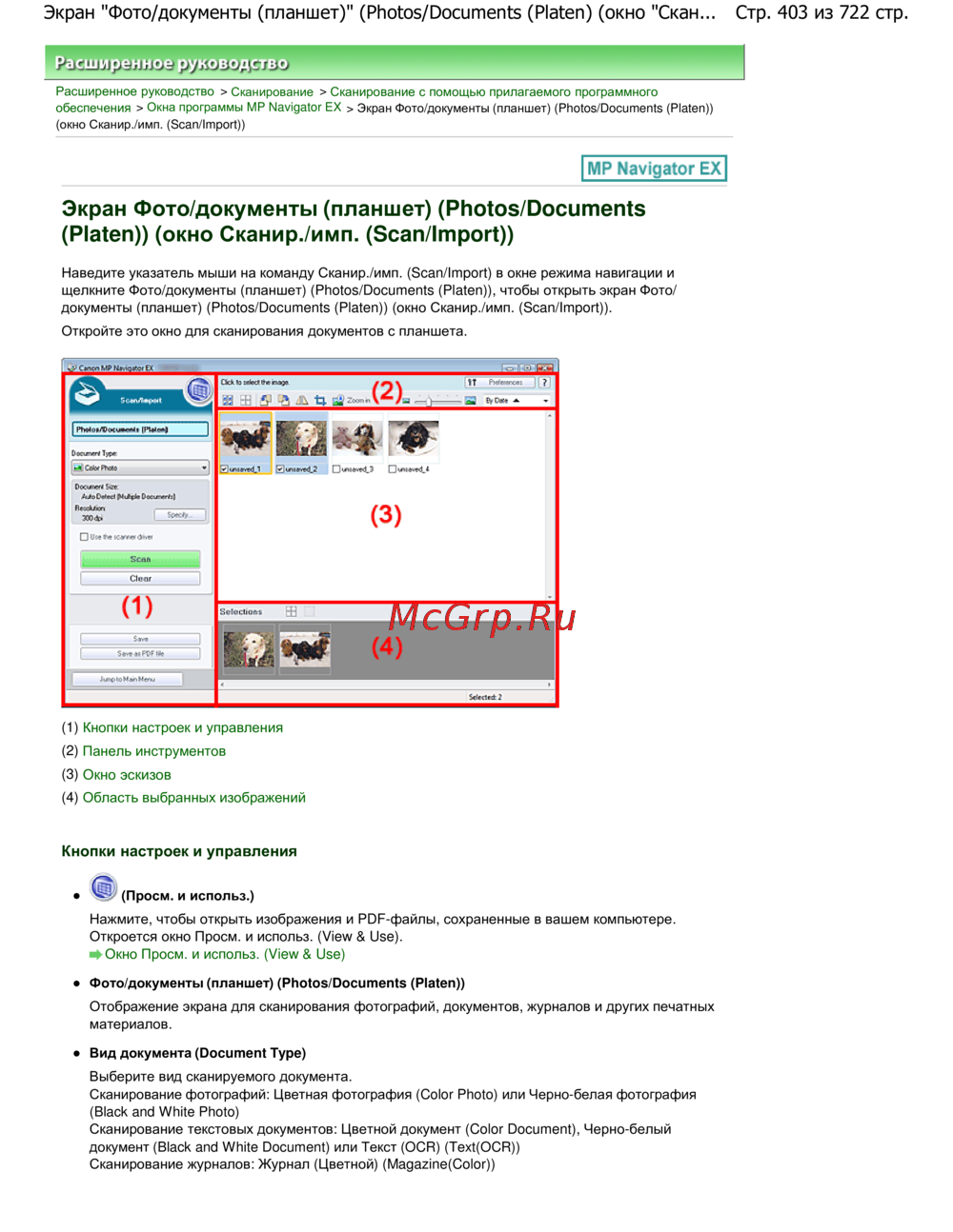Стр. 403 из 722 стр.Экран "Фото/документы (планшет)" (Photos/Documents (Platen) (окно "Скан...