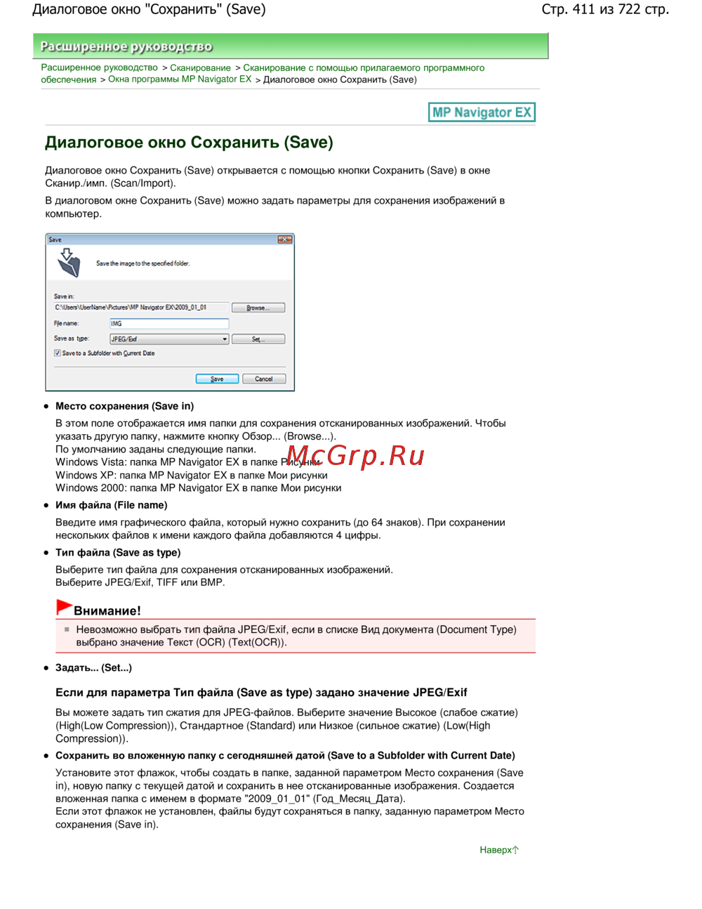 Windows XP: папка MP Navigator EX в папке Мои рисунки