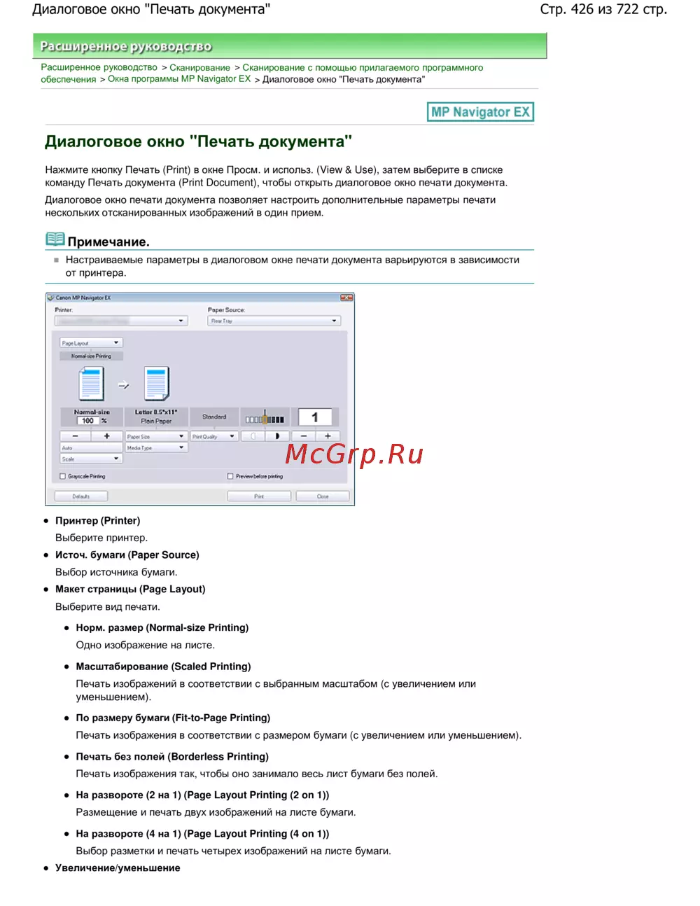 Canon Pixma MP 272 — диалоговое окно 'Печать документа' в MP Navigator EX: настройка параметров печати [426/722]