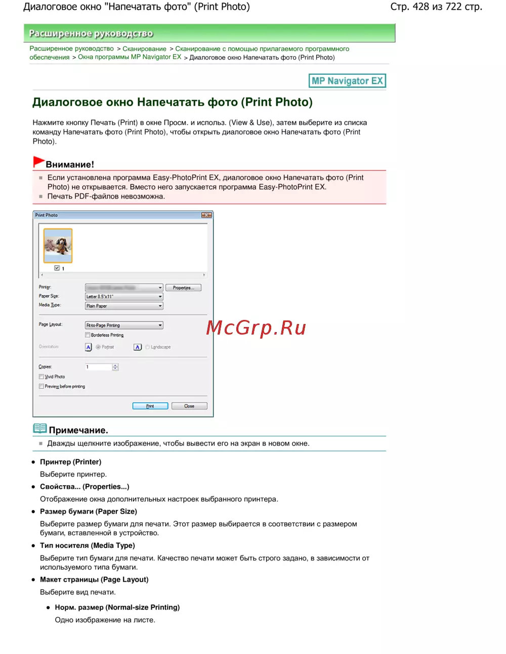 Стр. 428 из 722 стр.Диалоговое окно "Напечатать фото" (Print Photo)