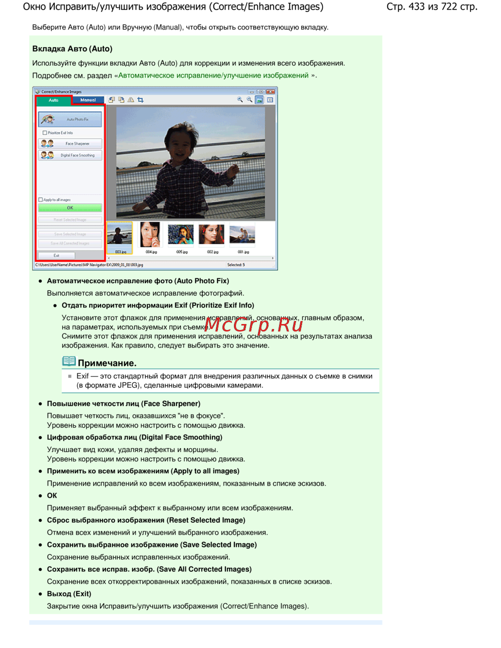 Canon Pixma MP 272 — коррекция и улучшение изображений: авто и ручной режимы, настройка Exif, обработка лиц [433/722]