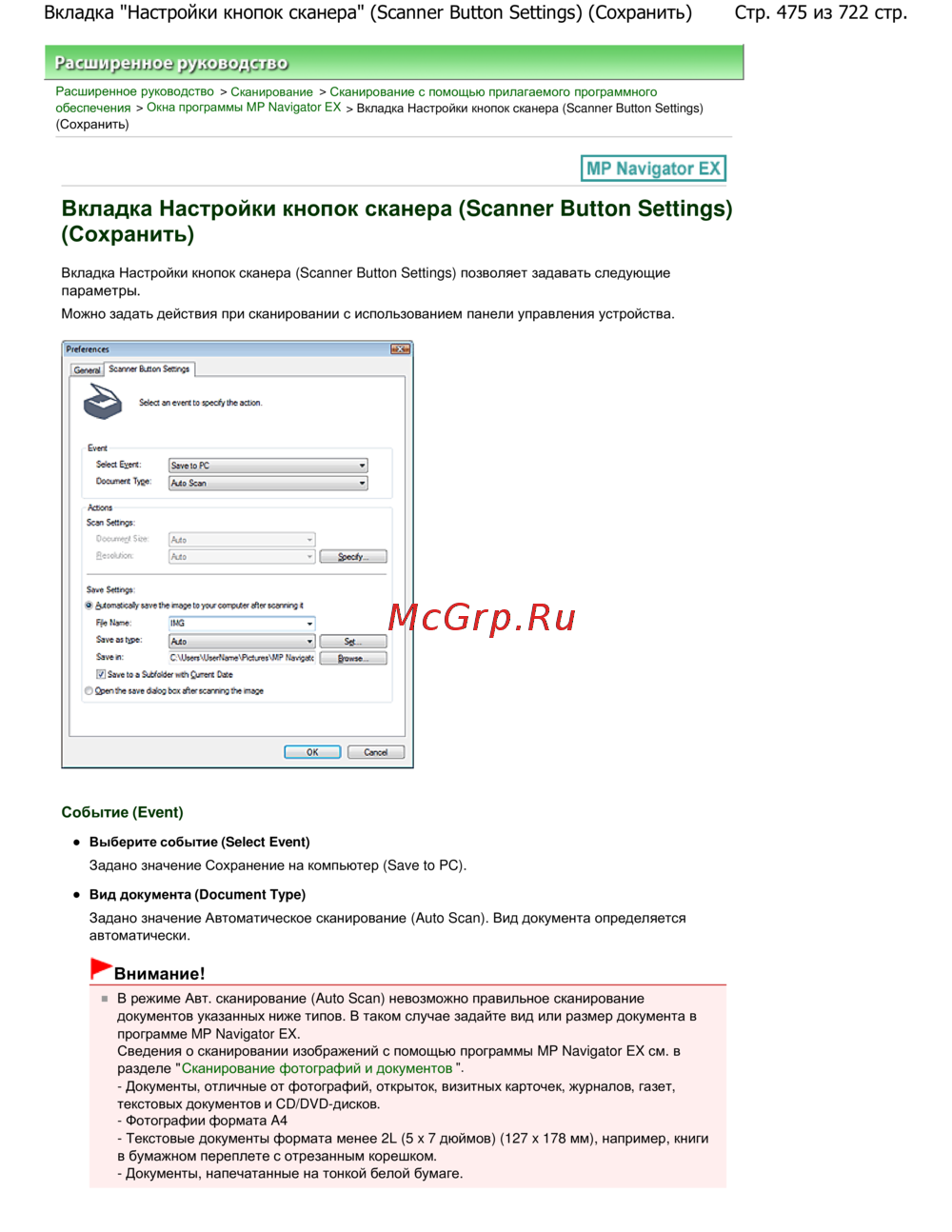 Стр. 475 из 722 стр.Вкладка "Настройки кнопок сканера" (Scanner Button Settings) (Сохранить)