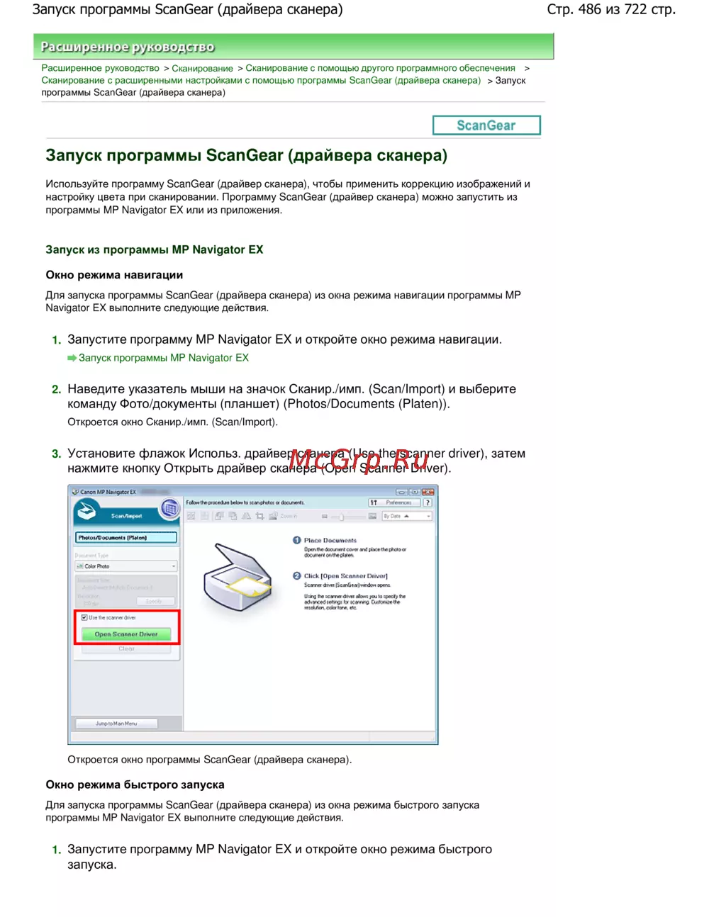 Стр. 486 из 722 стр.Запуск программы ScanGear (драйвера сканера)