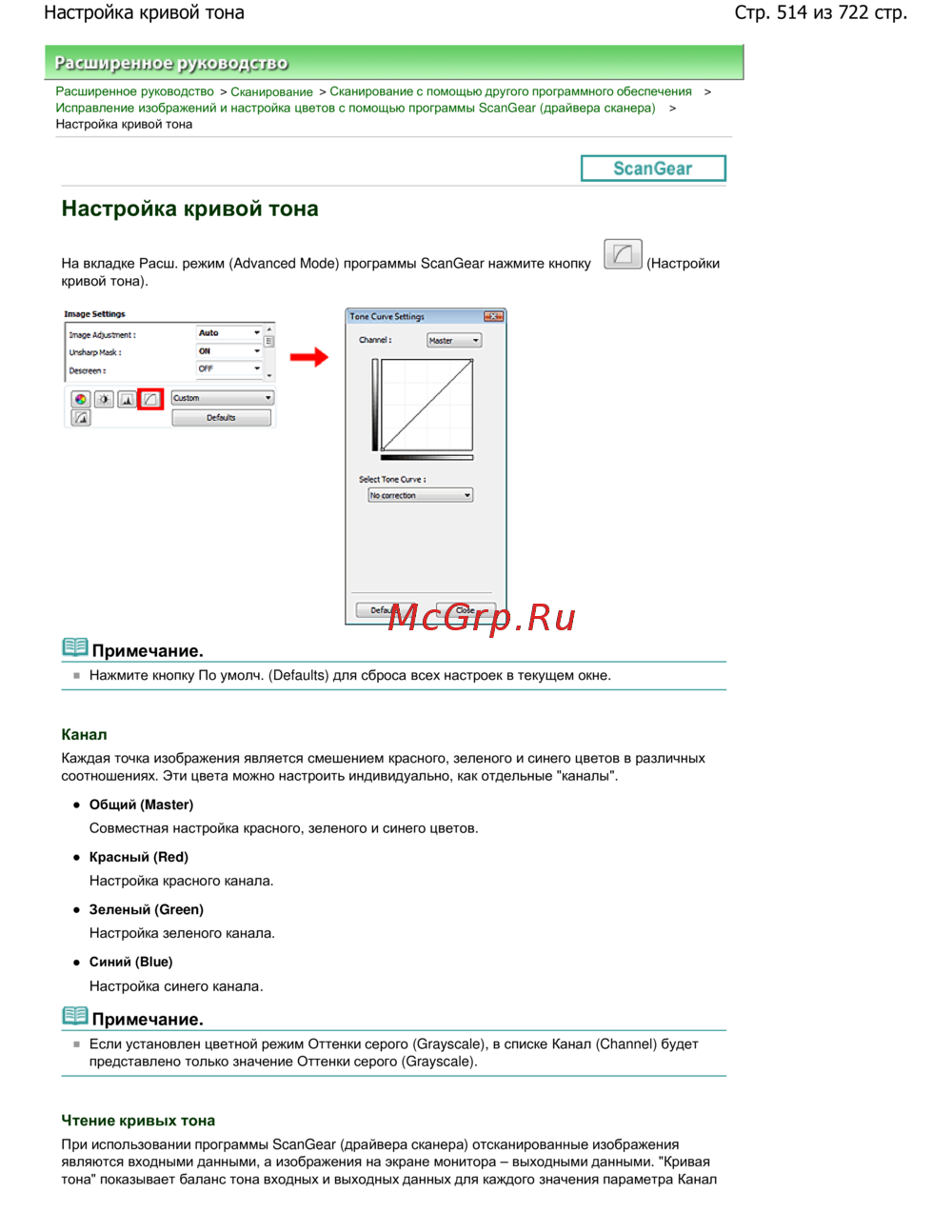 Инструкция по настройке кривой тона в ScanGear для улучшения цветов и баланса изображений. Рассмотрены каналы RGB и градации серого.