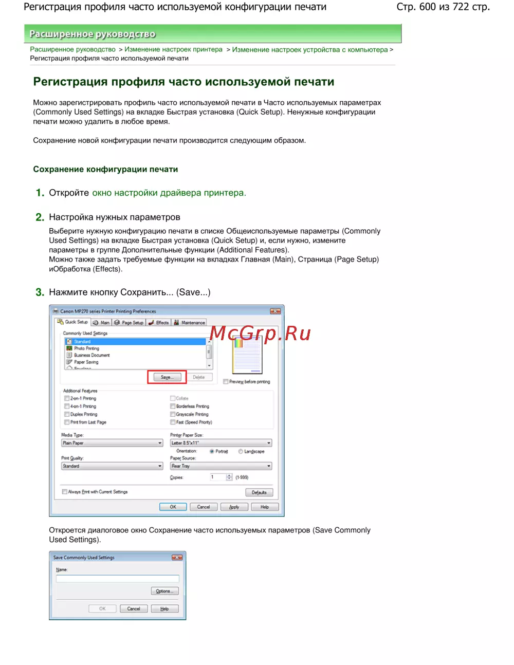Стр. 600 из 722 стр.Регистрация профиля часто используемой конфигурации печати