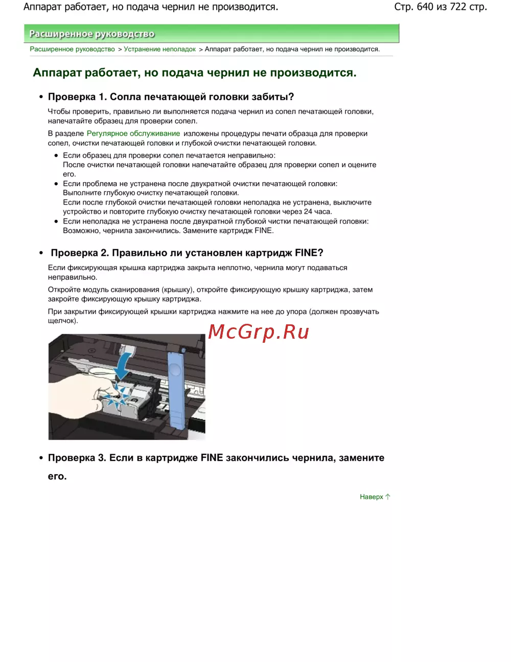 Стр. 640 из 722 стр.Аппарат работает, но подача чернил не производится.