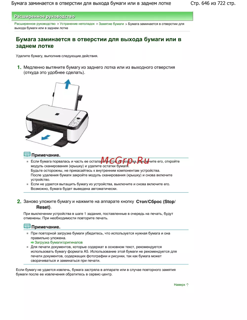 Стр. 646 из 722 стр.Бумага заминается в отверстии для выхода бумаги или в заднем лотке
