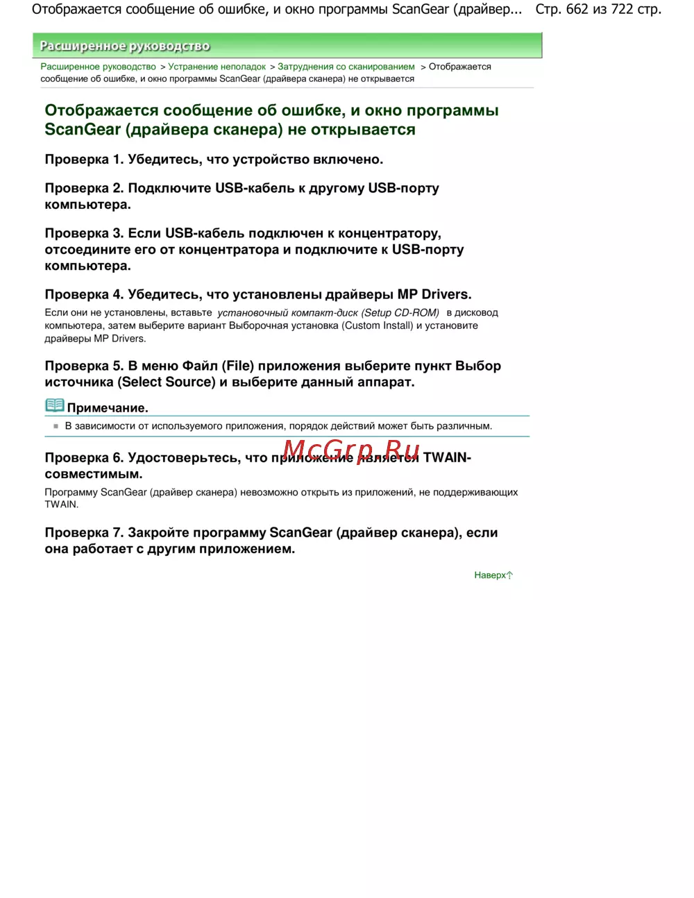 Стр. 662 из 722 стр.Отображается сообщение об ошибке, и окно программы ScanGear (драйвер...