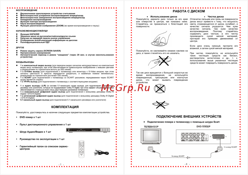 ВОСПРОИЗВЕДЕНИЕ РАБОТА С ДИСКОМ Двухволновое однолазерное устройство считывания Многоскоростное ускоренное воспроизведение вперед назад Многоскоростное замедленное воспроизведение вперед назад Покадровое воспроизведение Функция повтора воспроизведения Пауза воспроизведения Функция увеличения изображения ZOOM во время воспроизведения и паузы Использование диска Пожалуйста держите диск только за его края или отверстие в центре как показано ниже Старайтесь не прикасаться к блестящей его поверхности КАРАОКЕ МЕНЮ ДИСПЛЕЙ ПДУ Функция КАРАОКЕ Экранное меню на русском английском других языках Наличие на передней панели кнопок управления Отображение всеобъемлющей информации на дисплее Полнофункциональный ПДУ Чистка диска Отпечатки пальцев или грязь на поверхности диска могут привести к тому что мощность света отражающегося от диска ослабеет и качество сигнала ухудшится Чем хуже качество сигнала тем хуже качество воспроизведения Поэтому старайтесь содержать диск чистым а его чистку производите сухой мягкой материей протирая его прямыми движениями от центра Если диск очень грязный протрите влажной а затем сухой мягкой материей ДРУГОЕ Режим защиты экрана SCREEN SAVER Прогрессивное сканирование Автоматический переход в режим ожидание устройства Пожалуйста не наклеивайте никаких наклеек на диск а также стапайтесь его не наоапать через 20 мин в случае неиспользования ВХОДЫ ВЫХОДЫ 1 х композитный видео выход для передачи видео сигналов непосредственно на композитный видео вход телевизора при этом обеспечивается превосходное изображение с живыми цветами и разрешением по горизонтали вплоть до 500 линий 1 х S Video выход для подключения к телевизору или монитору с S Video входом при этом сигналы цветности и яркости передаются раздельно и взаимные помехи минимальны разрешение по горизонтали достигает 530 линий 1 х SCART для подключения к телевизору со SCART разъемом передаваемое через SCART аудио является стерео 1 х YPrPb выход для подключения к телевизору с соответствующими входами его При чистке пожалуйста не используйте таких чистящих средств как бензол растворители антистатики и др т к использование вы ню указанных чистящих средств может повредить поверхность диска Так как диск вращается с большой скоростью во время воспроизведения не используйте поврежденные треснувшие или изогнутые диски что может вызвать повреждение устройства 1 х аудио выходы L R в составе 5 1 канального аудио выхода для подключения к телевизору ресиверу или усилителю которые не поддерживают Dolby Digital при этом эффект объемного звучания обеспечивается с помощью всего лишь двух передних динамииэв телевизора 1 х коаксиальный цифровой аудио выход для подключения к внешнему декодеру Dolby Digital DTS Digital 1 х оптический цифровой аудио выход для подключения к внешнему декодеру Dolby Digital DTS Digital 5 1 канальный аудио выход для подключения 5 1 канального ресивера или усилителя КОМПЛЕКТАЦИЯ 11ожалуйста удостоверьтесь в наличии следующих предметов комплектации устройства DVD плеер х 1 шт ПОДКЛЮЧЕНИЕ ВНЕШНИХ УСТРОЙСТВ Подключение плеера к телевизору с помощью шнура Scart Пульт дистанционного управления х 1 шт Шнур Аудио Видео х 1 шт Руководство по эксплуатации х 1 шт Гарантийный талон со списком сервисцентров К выходу SCART