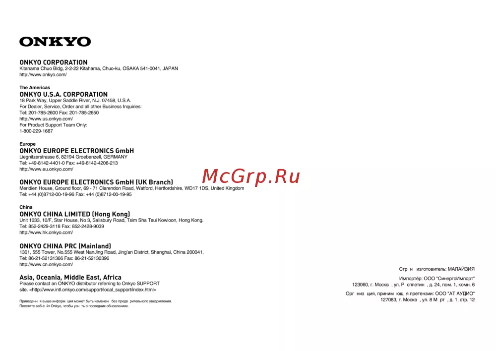 Посетите веб-сайт Onkyo, чтобы узнать о последних обновлениях.