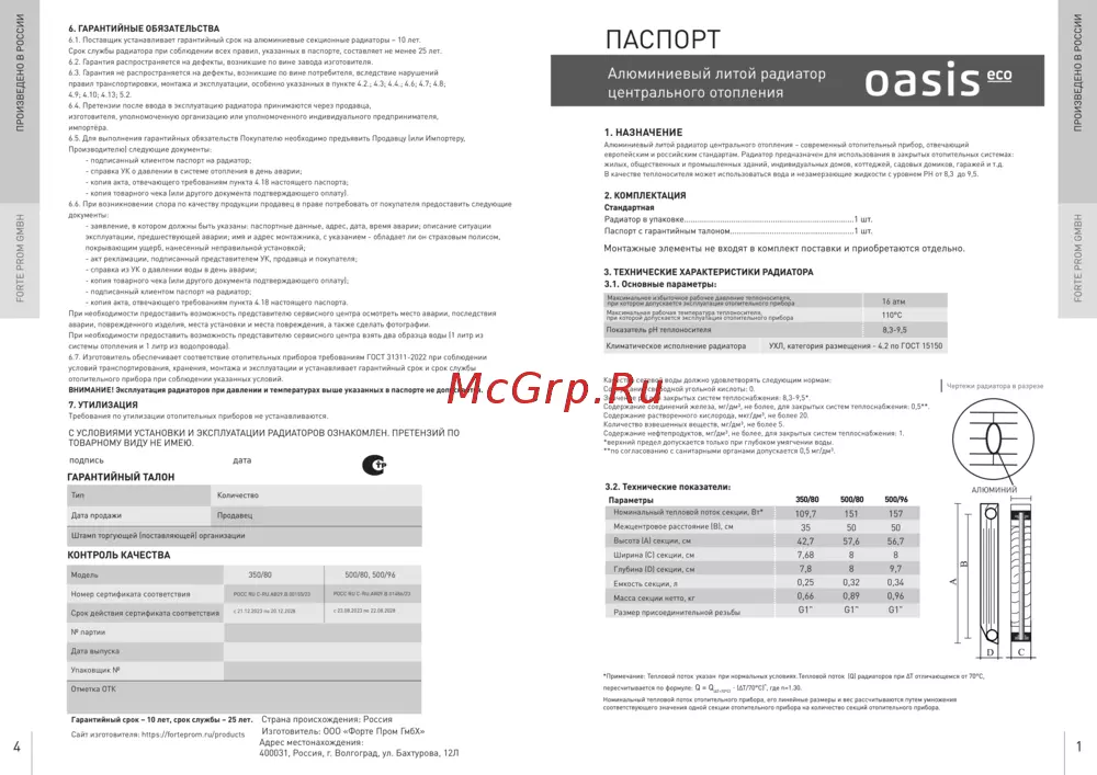 ВНИМАНИЕ! Эксплуатация радиаторов при давлении и температурах выше указанных в паспорте не допускается.