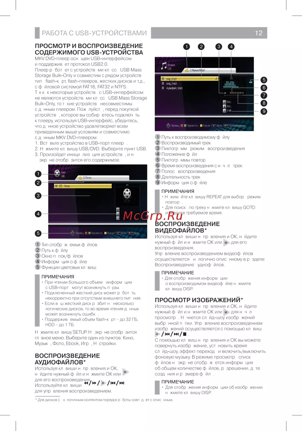 - Чтобы продлить срок службы вашего плеера делайте паузы не менее 30 секунд между выключением и повторным включением плеера отключайте электропитание плеера после завершения работы некоторые функции плеера не могут быть применимы к некоторым дискам используйте источники питания номинального напряжения иначе плеер не будет работать или будет поврежден в случае случайных остановок плеера пожалуйста выключите электропитание и включите его снова на одном носителе не рекомендуется создавать более 160 папок и записывать более 600 файлов в одну папку допустимая глубина вложений не более 4 уровней поддерживаемый объем flash карт _ до 32 гб hdd _ до 1 тб p.25