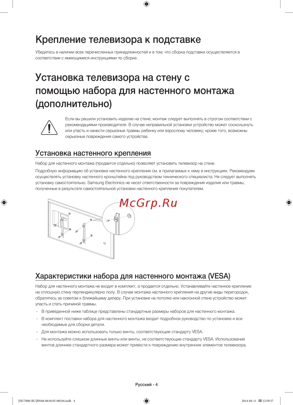- Установка телевизора на стену с помощью набора для настенного монтажа дополнительно p.4