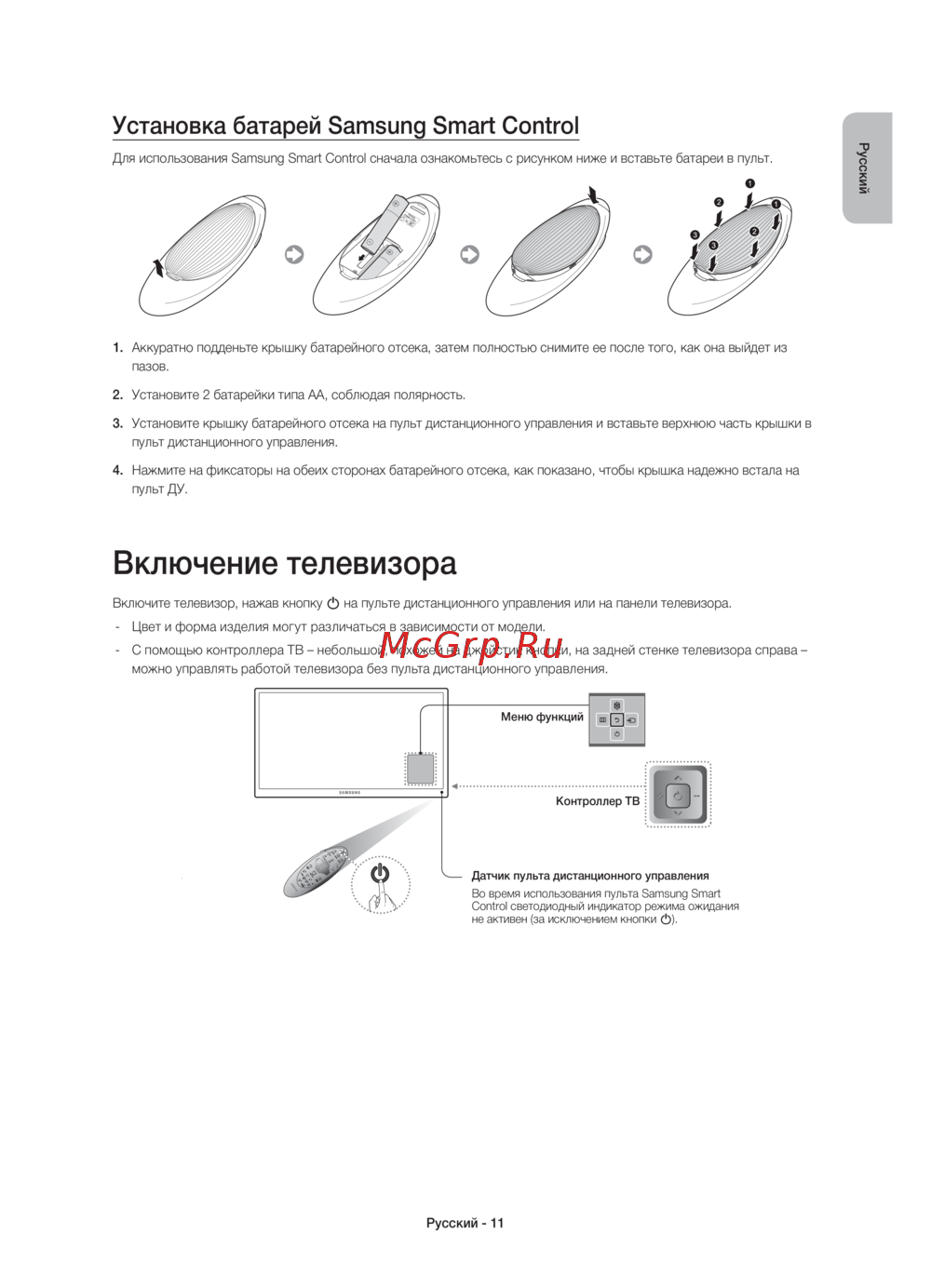 Для использования Samsung Smart Control сначала ознакомьтесь с рисунком ниже и вставьте батареи в пульт.