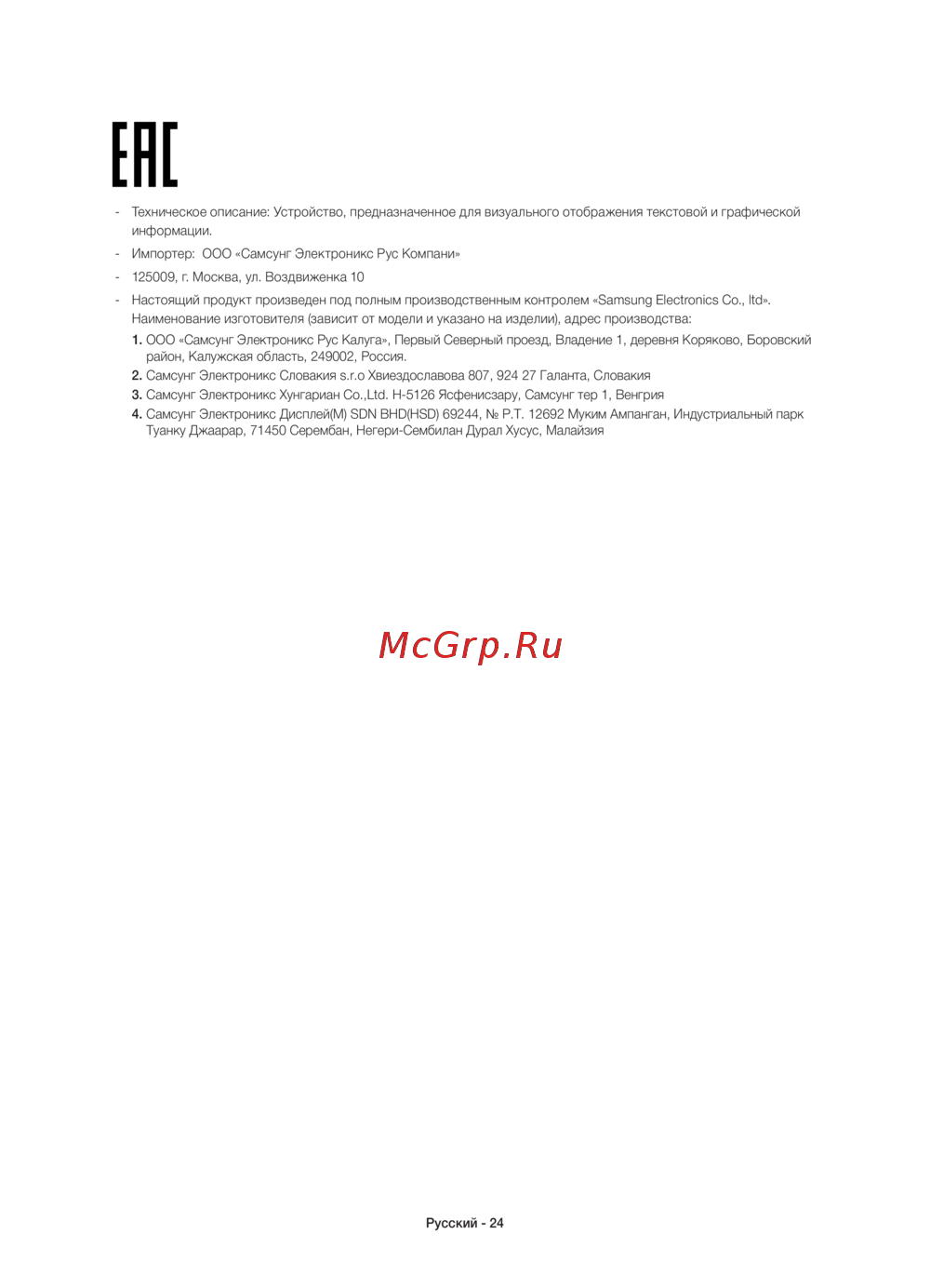 - Импортер: ООО «Самсунг Электроникс Рус Компани»