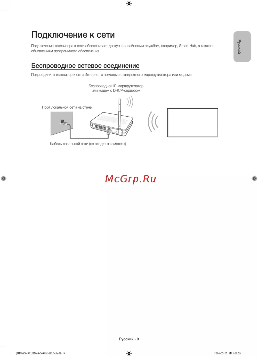 - В зависимости от настроек сети существует три основных способа подключения телевизора к сети с помощью кабеля эти способы показаны ниже p.20