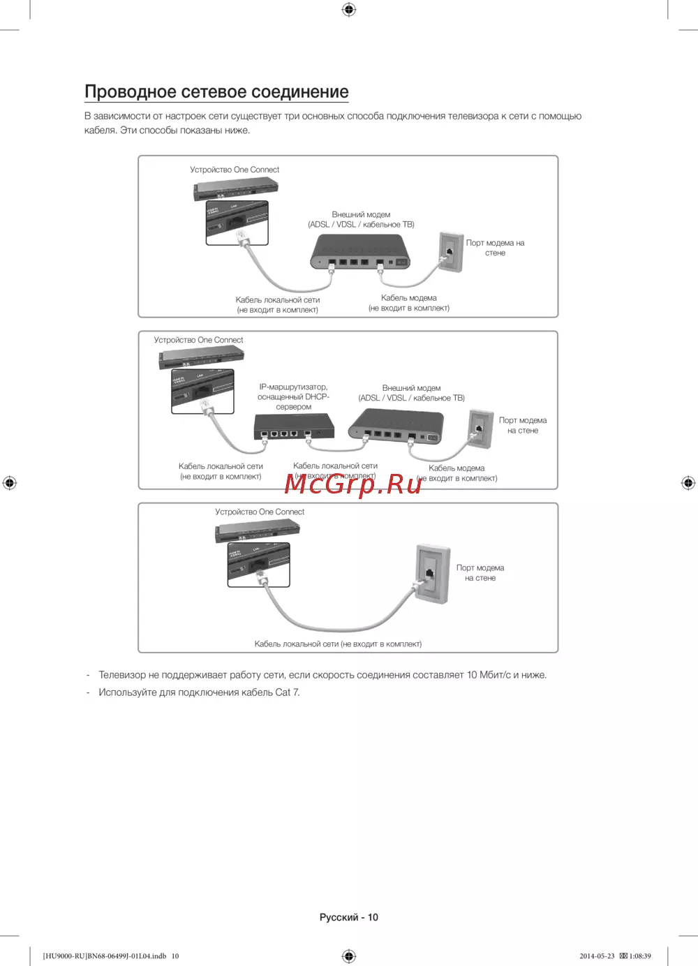 - В зависимости от настроек сети существует три основных способа подключения телевизора к сети с помощью кабеля эти способы показаны ниже p.20