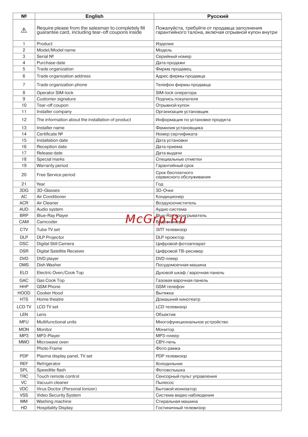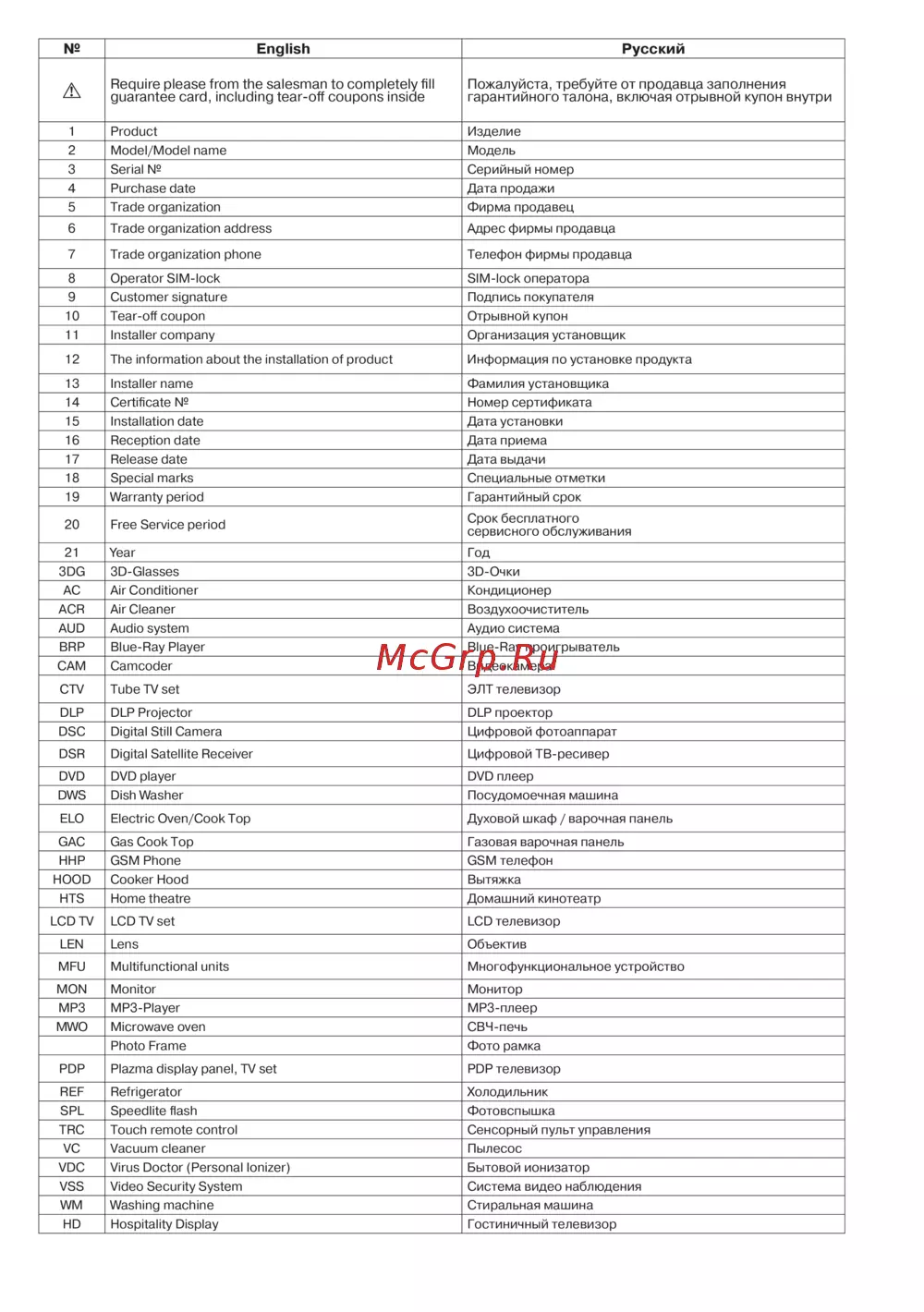 - Пожалуйста требуйте от продавца заполнения гарантийного талона включая отрывной купон внутри p.3