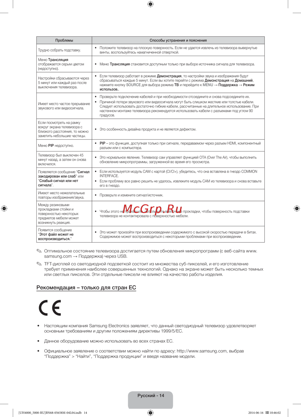 - При возникновении проблем связанных с работой телевизора сначала просмотрите список возможных проблем и способов их устранения если ни один из перечисленных советов не поможет устранить неисправность посетите веб узел www samsung com и выберите пункт поддержка или обратитесь в центр обслуживания клиентов samsung p.22