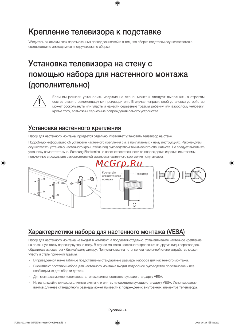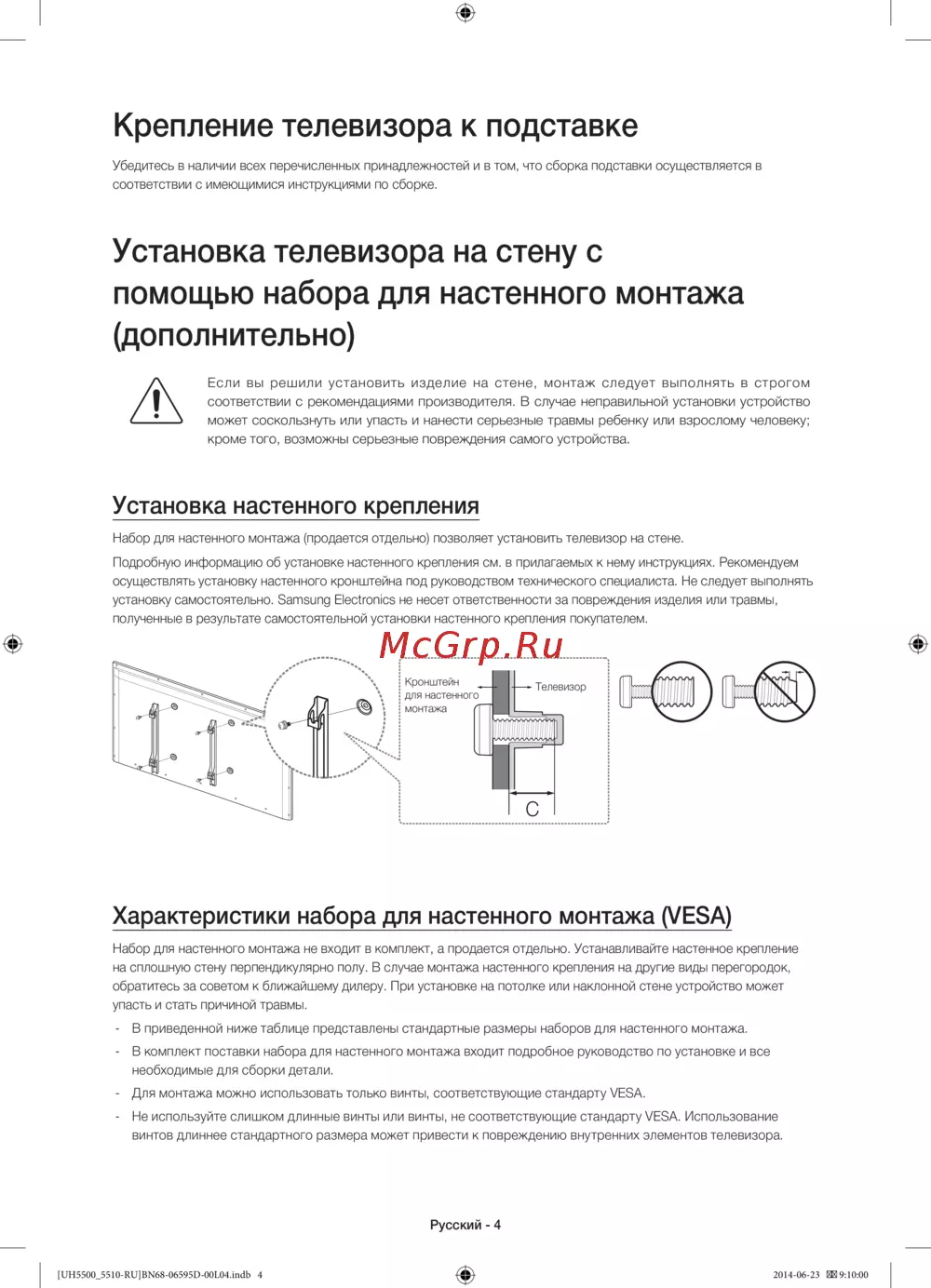 - Установка телевизора на стену с помощью набора для настенного монтажа дополнительно p.4