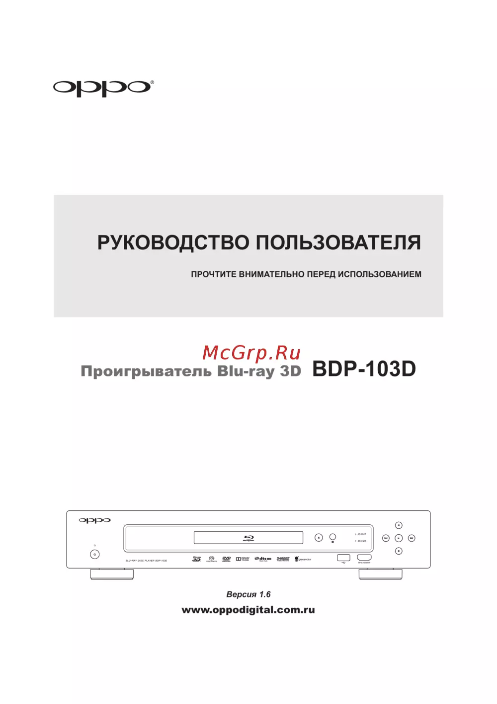 O O OCX РУКОВОДСТВО ПОЛЬЗОВАТЕЛЯ ПРОЧТИТЕ ВНИМАТЕЛЬНО ПЕРЕД ИСПОЛЬЗОВАНИЕМ Проигрыватель Blu ray 3D BDP 103D эррэ О 0о О X о о S3 2 шв ИВЕ Версия 1 6 www oppodigital com ru I к J MOWWU