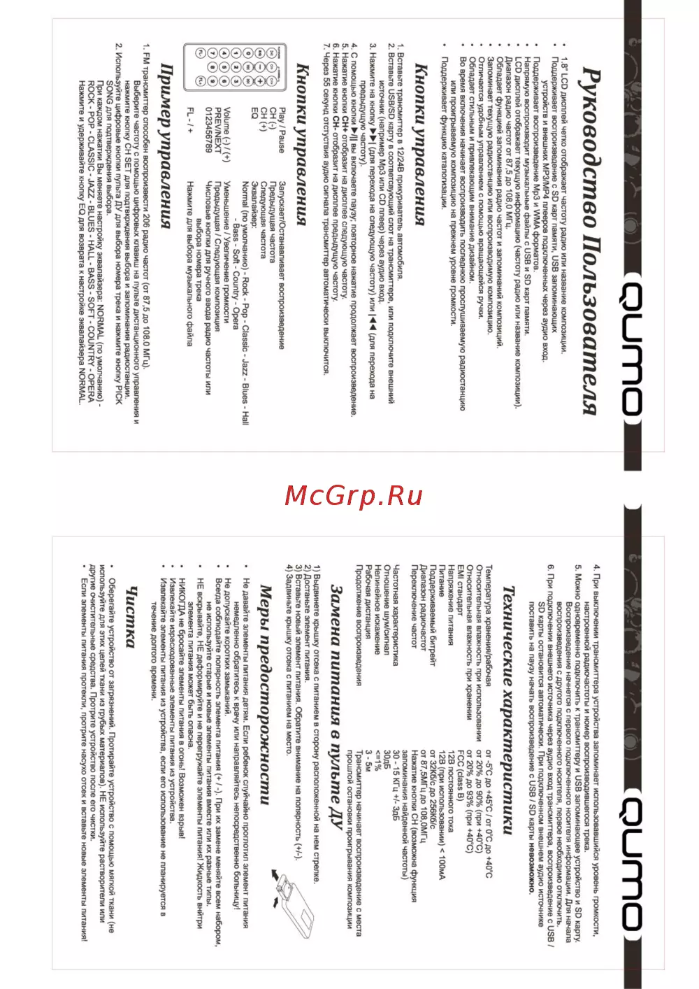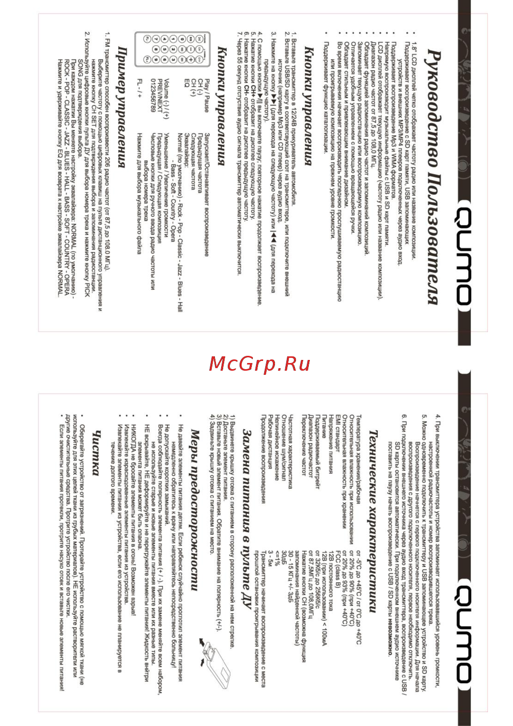 сито Qumo Руководство Пользователя 1 8 LCD дисплей четко отображает частоту радио или название композиции Поддерживает воспроизведение о SD карт памяти USB запоминающих устройств и внешних МРЗ МР4 плееров подключенных через аудио вход Поддерживает воспроизведение Mp3 и WMA форматов Напрямую воспроизводит музыкальные файлы с USB и SD карт памяти LCD дисплей отображает текущую информацию частоту радио или название композиции Диапазон радио частот от 87 5 до 108 0 МГц Обладает функцией запоминания радио частот и запоминаний композиций Запоминает текущую радиостанцию или воспроизводимую композицию Отличается удобным управлением с помощью вращающейся ручки Обладает стильным и привлекающим внимание дизайном Во время включения начинает воспроизводить последнюю прослушиваемую радиостанцию или проигрываемую композицию на прежнем уровне громкости Поддерживает функцию каталогизации Кнопки управления 1 Вставьте трансмиттер в 12 24В прикуриватель автомобиля 2 Вставьте 113В 5О карту в соответсвующий слот на трансмиттере или подключите внешний источник например МрЗ или СО плеер через аудио вход 3 Нажмите на кнопку для перехода на следующую частоту или 4 4 для перехода на предыдущую частоту 4 С помощью кнопки вы включаете паузу повторное нажатие продолжает воспроизведение 5 Нажатие кнопки СН отобразит на дисплее следующую частоту 6 Нажатие кнопки СН отобразит на дисплее предыдущую частоту 7 Через 55 секунд отстуствия аудио сигнала трансмиттер автоматически выключится Кнопки управления Play Pause CH CH EQ Volume PREV NEXT 0123456789 FL Запускает Останавливает воспроизведение Предыдущая частота Следующая частота Эквалайзер Normal по умолчанию Rock Pop Classic Jazz Blues Hall Bass Soft Country Opera Уменьшение Увеличение громкости Предыдущая I Следующая композиция Числовые кнопки для ручного ввода радио частоты или выбора номера трека Нажмите для выбора музыкального файла Пример управления 1 FM трансмиттер способен воспроизвести 206 радио частот от 87 5 до 108 0 МГц Выберите частоту с помощью цифровых клавиш на пульте дистанционного управления и нажмите кнопку CH SET для подтвкрждения выбора и запоминания радиостанции 2 Используйте цифровые кнопки пульта ДУ для выбора номера трека и нажмите кнопку PICK SONG для подтверждения выбора При каждом нажатии Вы меняете настройку эквалайзера NORMAL по умолчанию ROCK POP CLASSIC JA22 BLUES HALL BASS SOFT COUNTRY OPERA Нажмите и удерживайте кнопку EQ для возврата к настройке эквалайзера NORMAL 4 При выключении трансмиттера устройства запоминает использовавшийся уровень громкости настроенной радиочастоты и номер воспроизводившегося трека 5 Можно одновременно подключить к трансмиттеру и USB запоминающее устройство и SD карту Воспроизведение начнется с первого подключенного носителя информации Для начала воспроизведения с другого подключенного носителя первое необходимо отключить 6 При подключении внешнего источника через аудио вход трансмиттера воспроизведение с USB SD карты остановится автоматически При подключенном внешнем аудио источнике поставить на паузу начать воспроизведение с USB SD карты невозможно Технические характеристики Температура хранения рабочая Относительная влажность при использовании Относительная влажность при хранении EMI стандарт Напряжение питания Питание Поддерживаемый битрейт Диапазон радиочастот Переключение частот Частотная характеристика Отношен