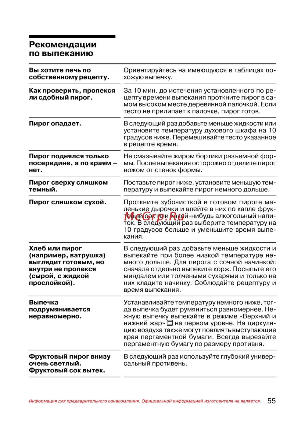 - Дополнительную информацию вы найдете в раз деле рекомендации по выпеканию p.53