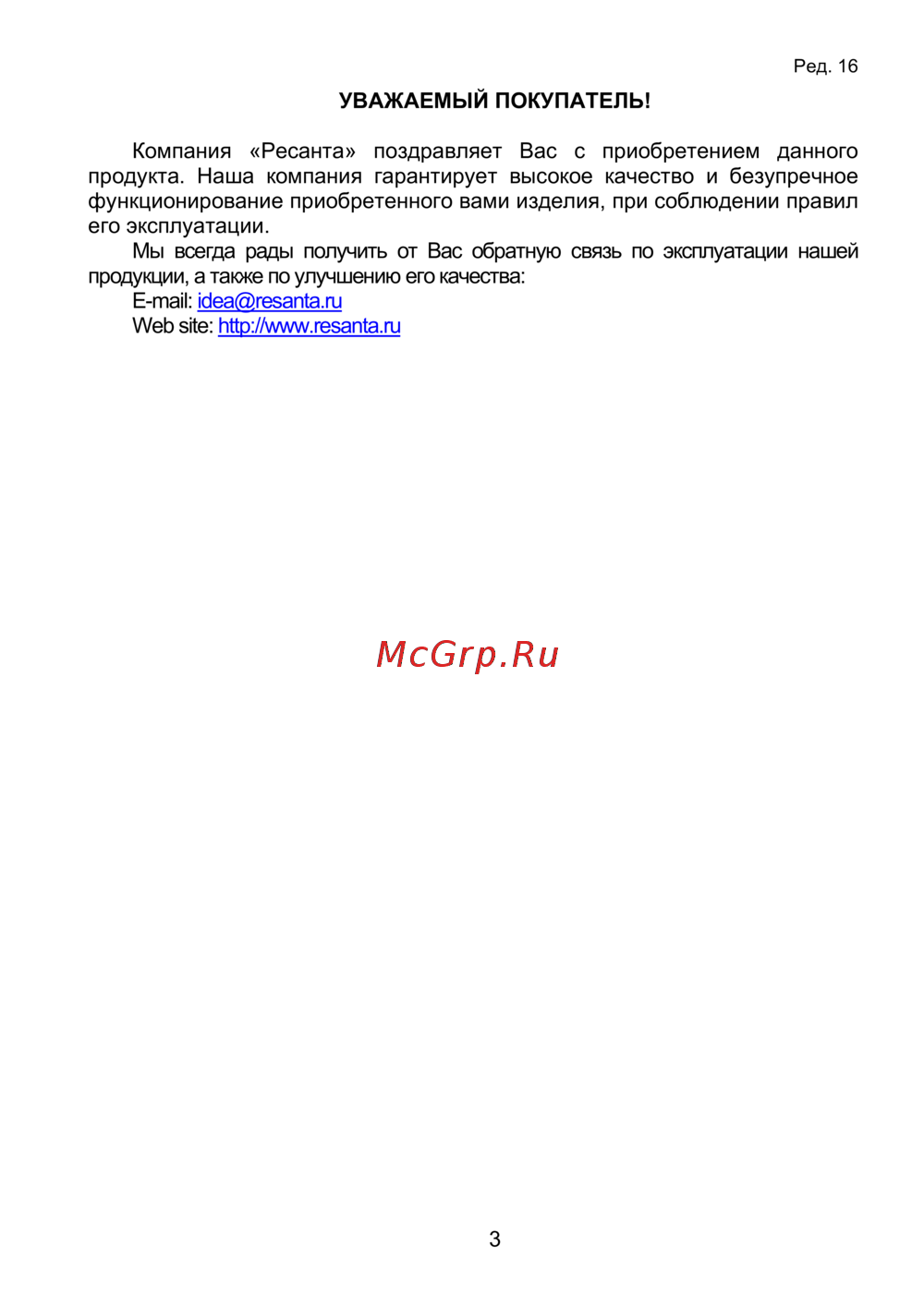 Компания «Ресанта» поздравляет Вас с приобретением данного