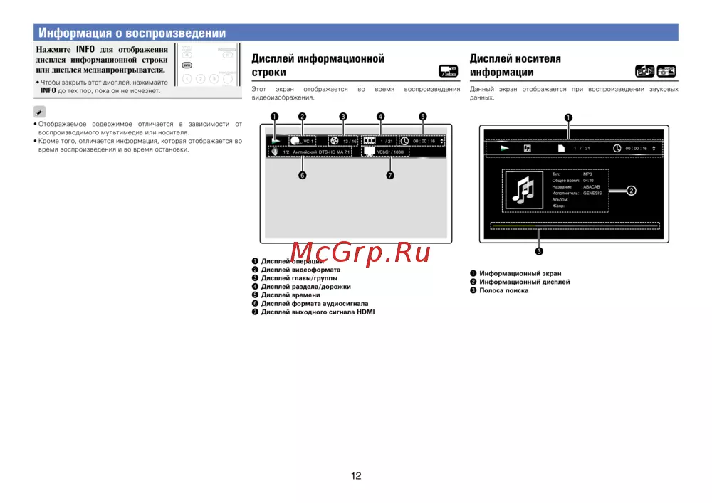 Узнайте, как использовать дисплеи информации при воспроизведении мультимедиа. Получите советы по отображению данных и управлению воспроизведением.