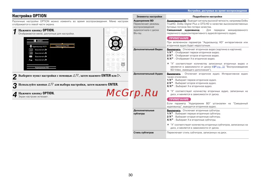 Различные настройки OPTION можно изменять во время воспроизведения. Меню настроек