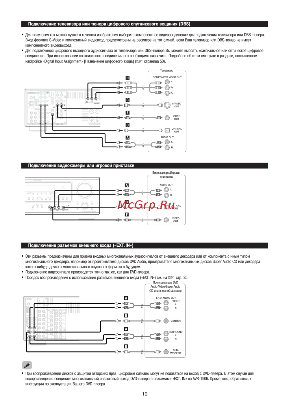 - Подключение телевизора или тюнера цифрового спутникового вещания dbs p.19