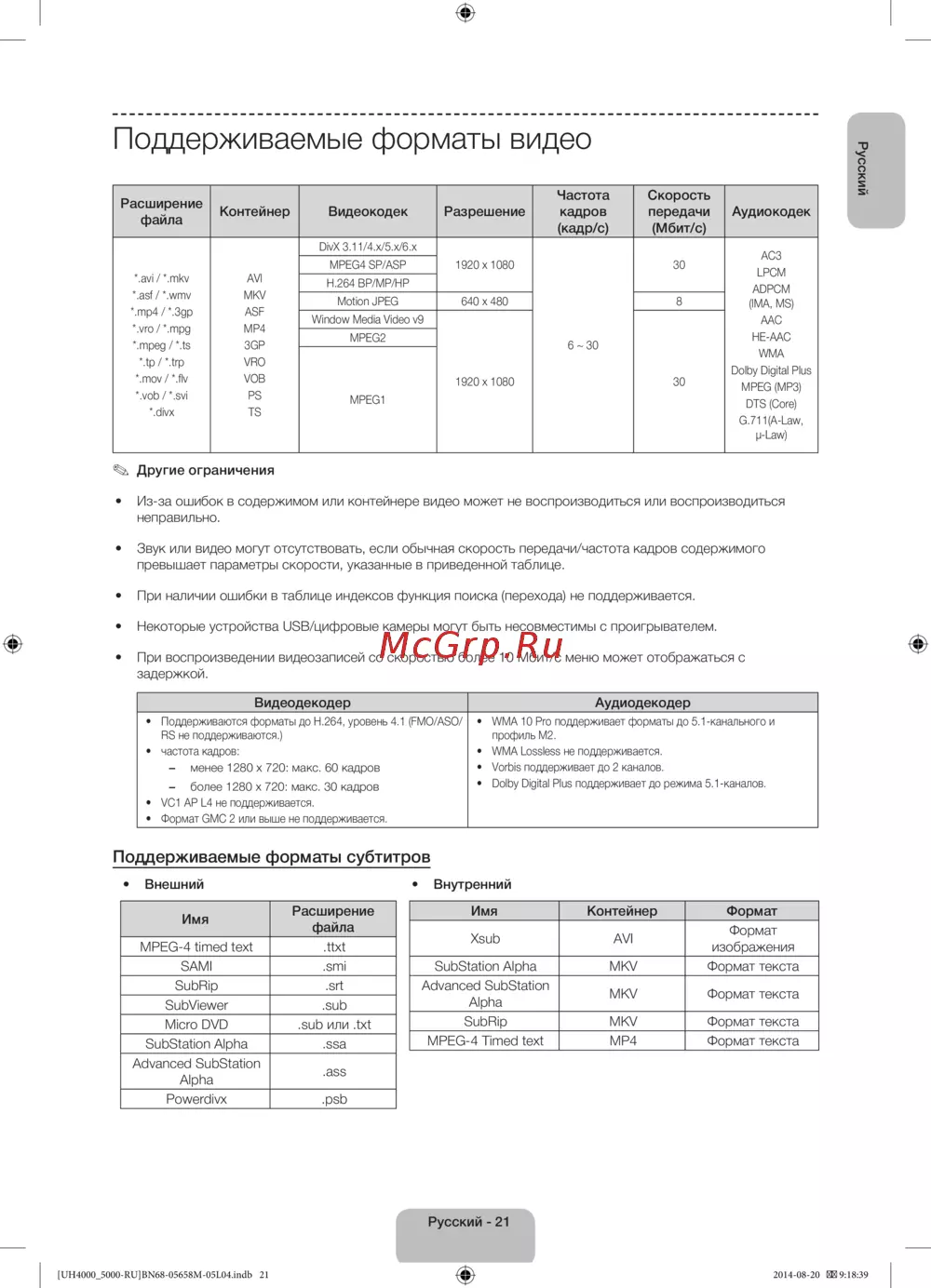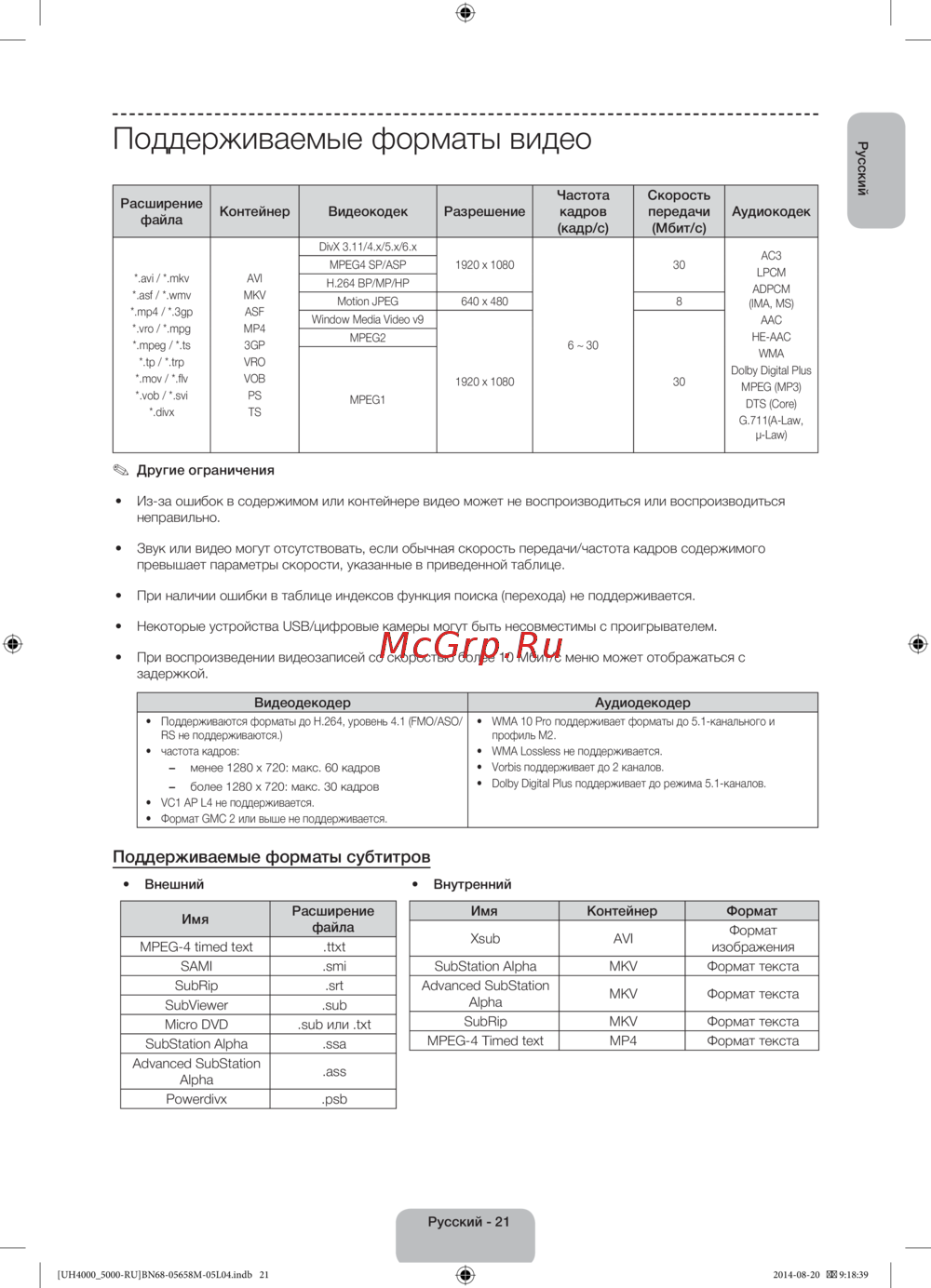 Samsung UE24H4080AU — поддерживаемые форматы видео и аудио для воспроизведения [21/100]