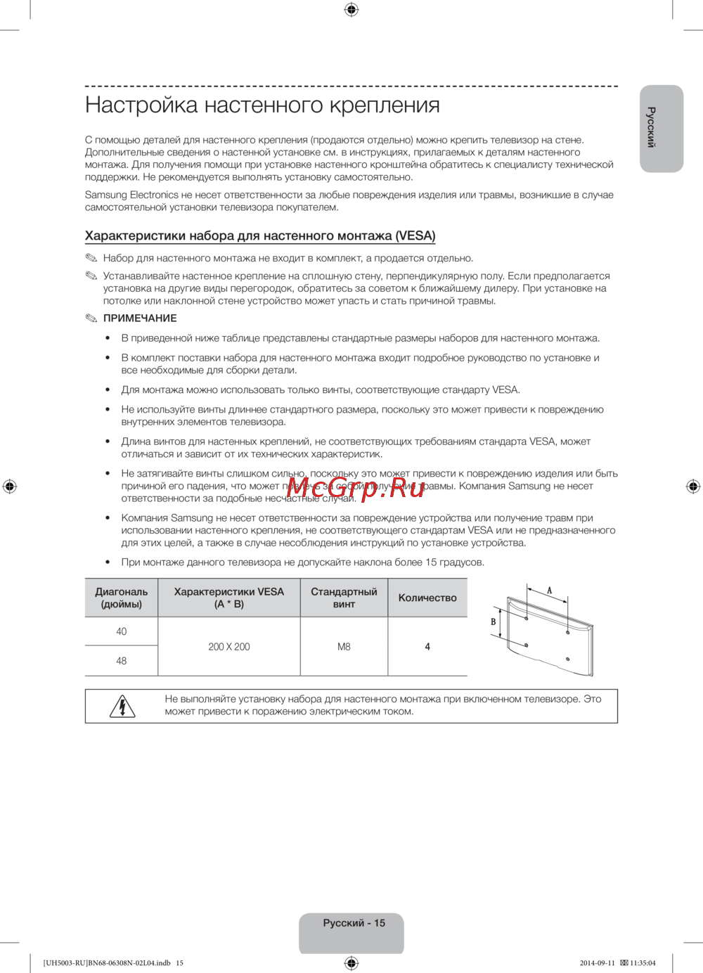 Samsung UE40H5003AK [15/23] Настройка настенного крепления