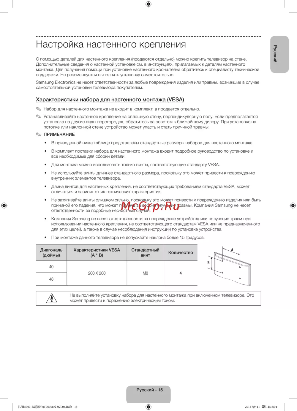 • Для монтажа можно использовать только винты, соответствующие стандарту VESA.