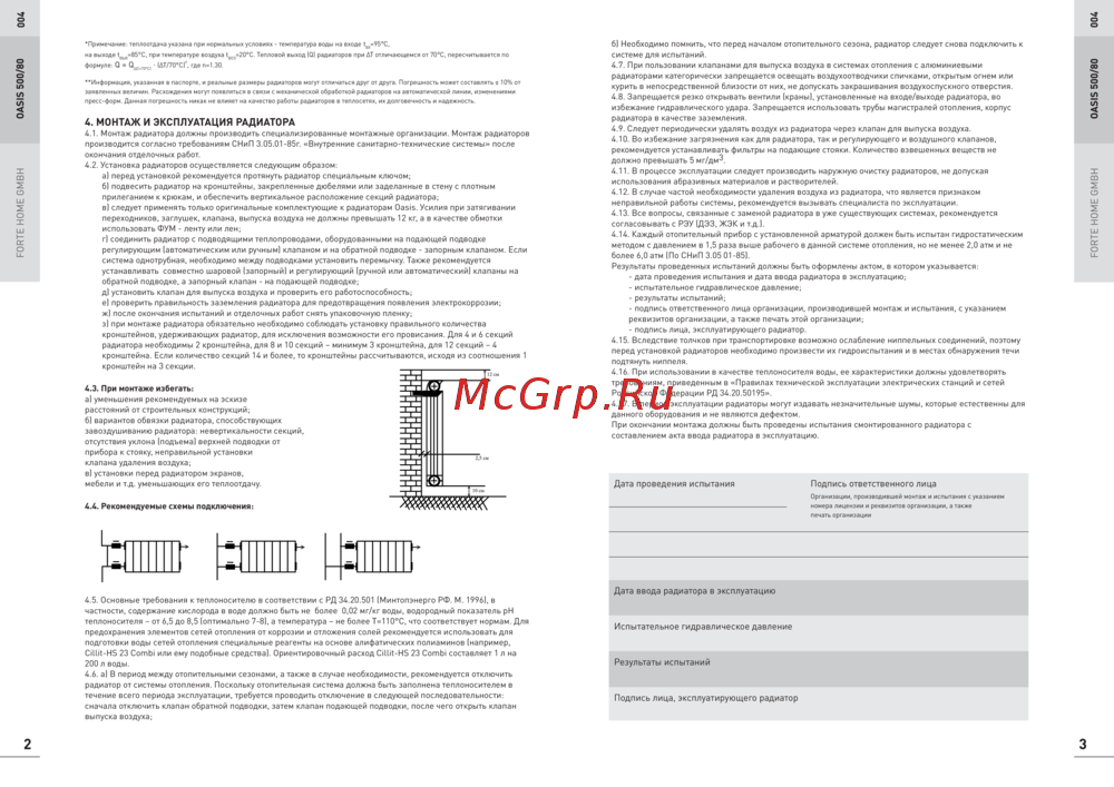 4.1. Монтаж радиатора должны производить специализированные монтажные организации. Монтаж радиаторов